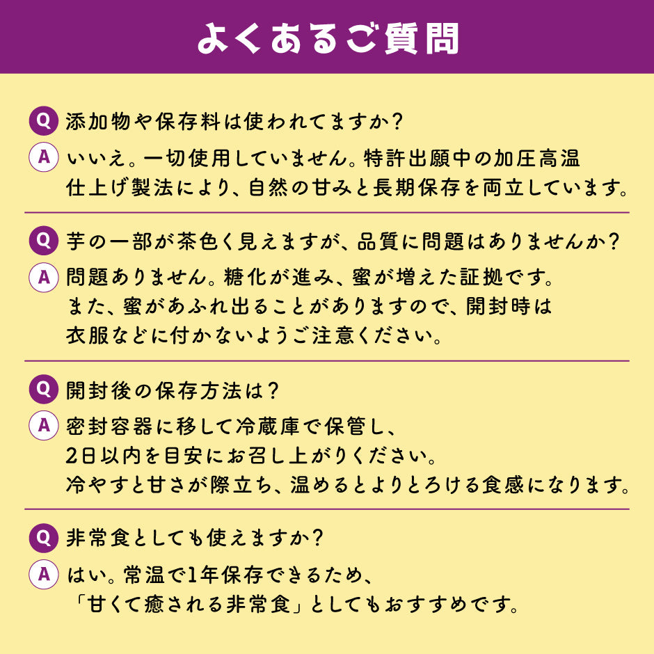 特許出願中の独自製法により、蜜が滴るような甘さとねっとり感を常温保存で実現した焼き芋缶です。